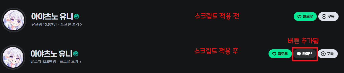 해당 스크립트 설치시 위 사진과 같이 "라이브" 버튼이 추가되고 해당 버튼을 누르게 될 경우 기존 트위치 처럼 채팅창 및 방송전에 해당 방에 편하게 들어가 있을 수 있습니다.