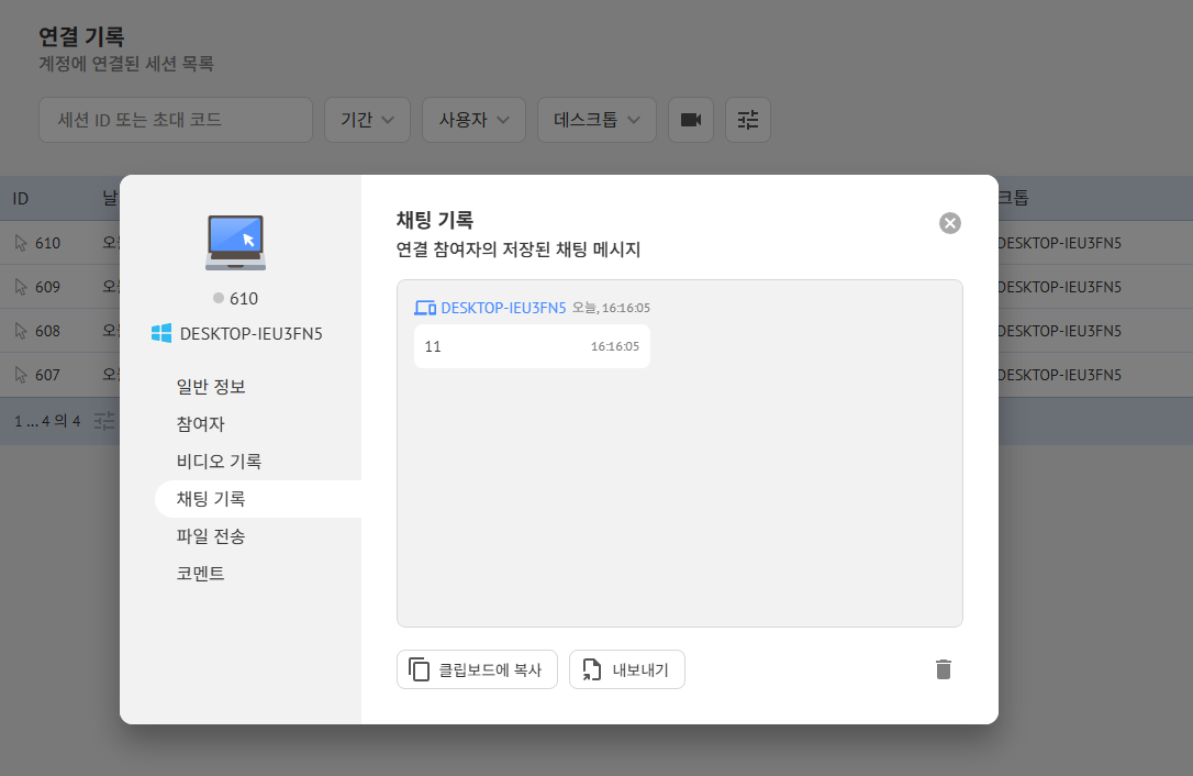 원격 지원 과정중에 했던 채팅, 녹화, 파일 전송 기록 등을 확인할 수 있고, 해당 연결에 대한 메모도 남겨둘 수 있습니다.