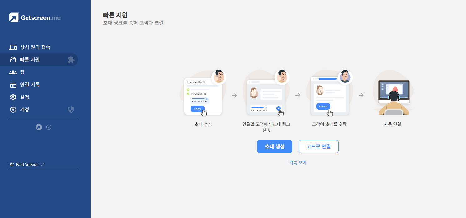 초대 생성의 경우는 단순하게 웹사이트 주소를 누르는것만으로 원격제어를 진행 할 수 있습니다.