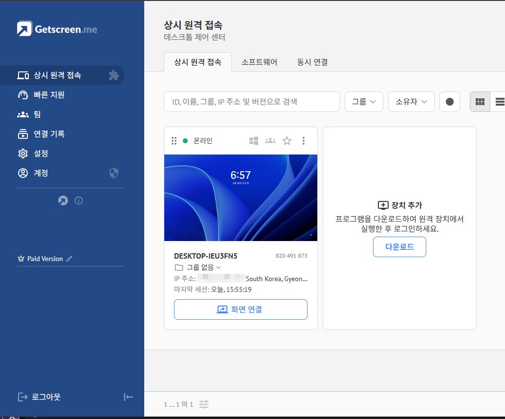 정상적으로 기기가 추가된 경우 화면이 변경 되고, 관리자 대시보드의 상시 원격 접속 화면을 확인하면 ...