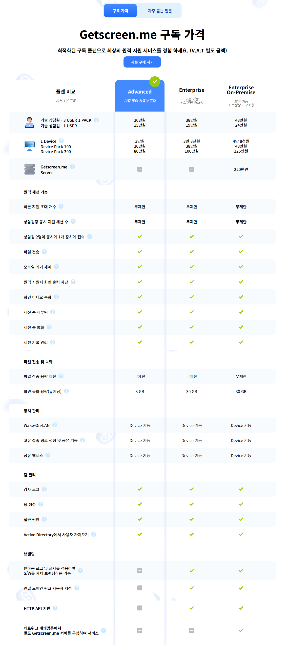 겟스크린가 가지는 장점으로는 세션 갯수 무제한, 파일 송수신 용량 제한 없음 등의 장점을 가지고도 합리적인 가격을 가지고 있네요.