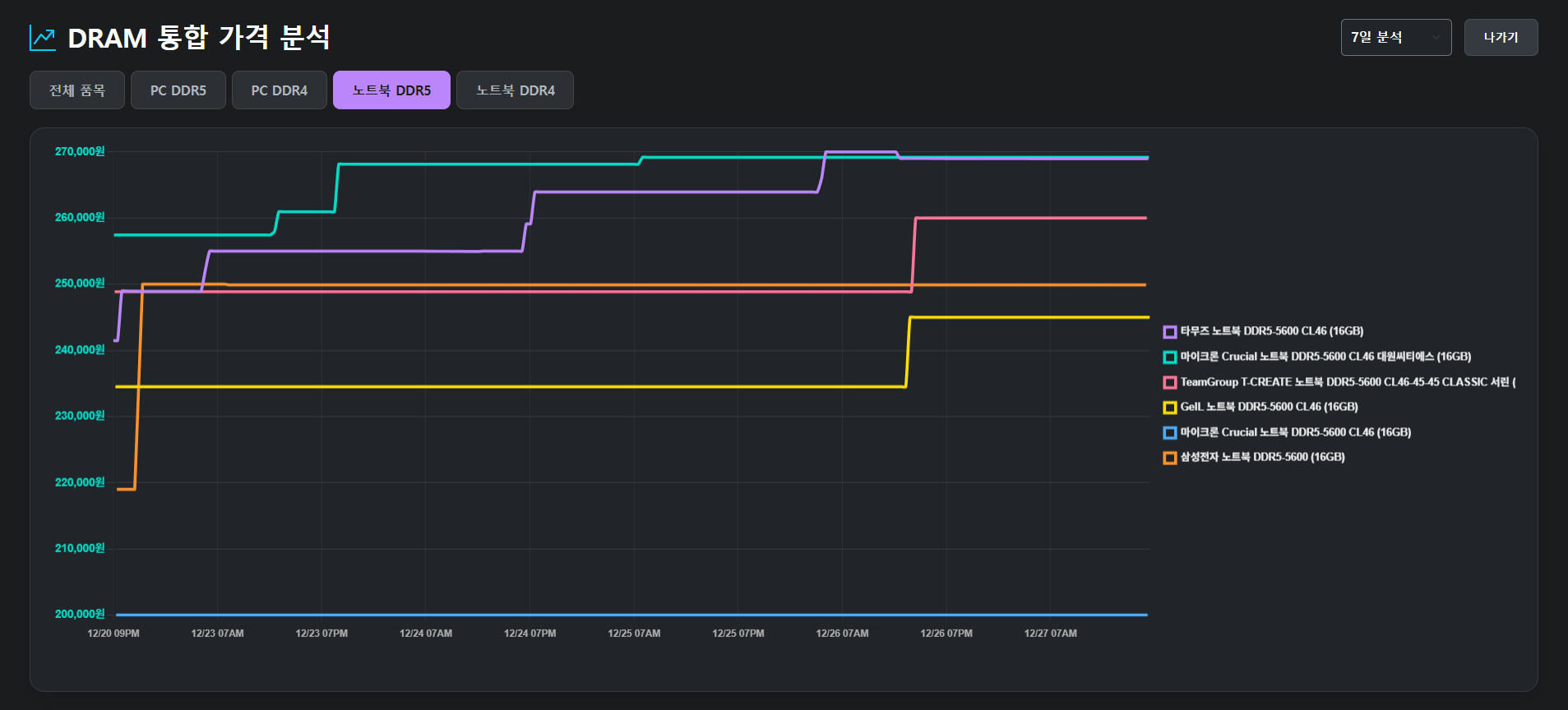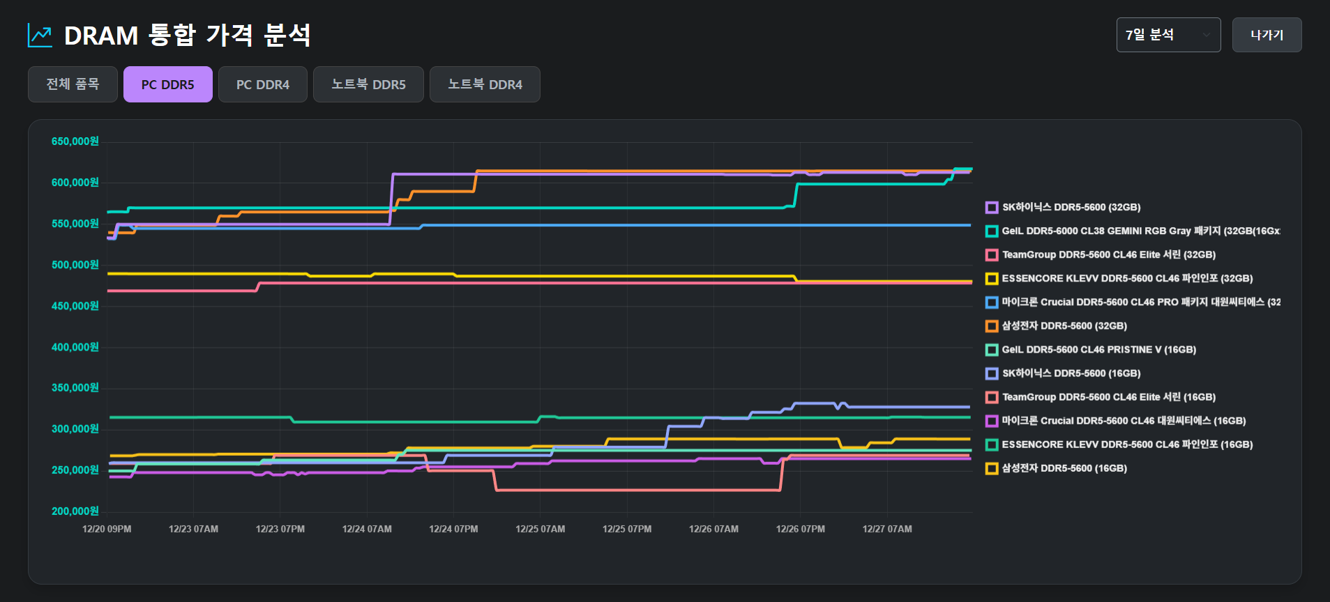 | SK하이닉스 DDR5-5600 (32GB) | 613,120원 ▲ 2025-12-27 18:30:38 |