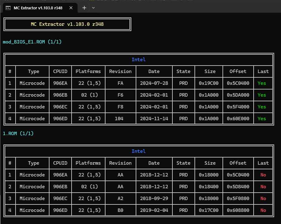 > 상단) 수정 BIOS / 하단) 원본 BIOS